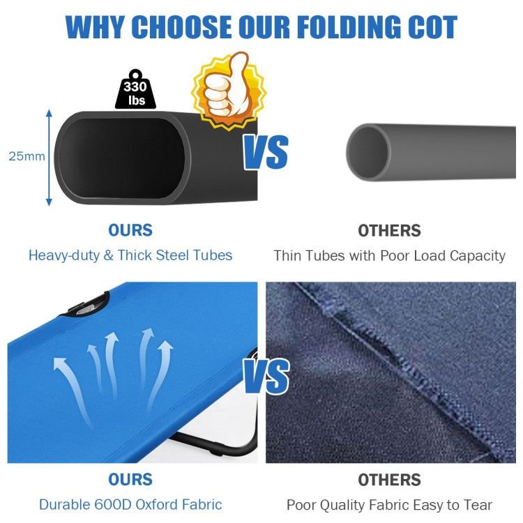 ● Breathable Fabric and Easy to Maintain: Made of breathable 600D Oxford cloth, this camping cot allows you to fall asleep quickly and comfortably. This wear-resistant and the waterproof surface is washable and can be used for the long term.