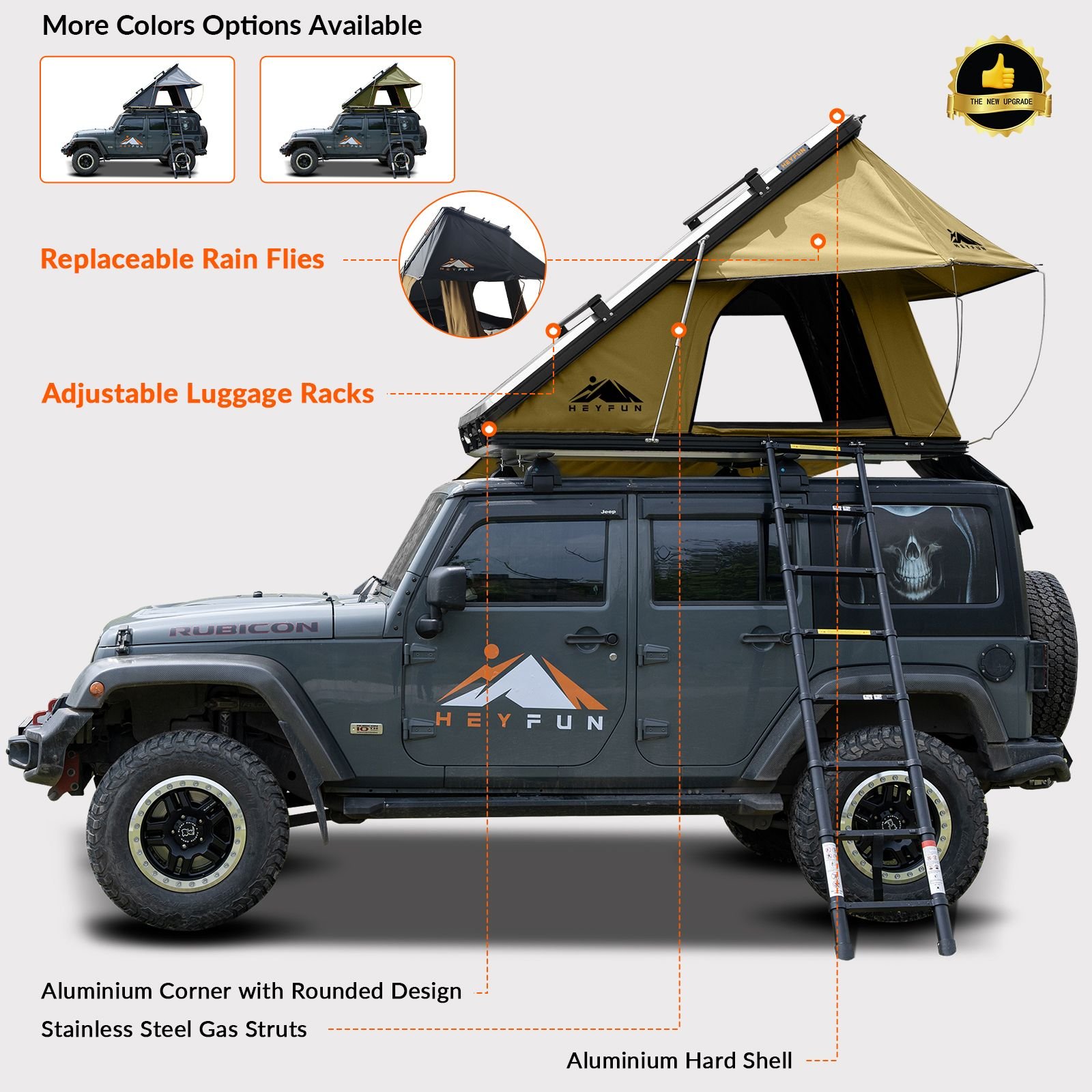 2. [Aluminum Roof Top Tent to 100% Market Excellence] - HEYFUN rooftop tents, directly from the industry-leading manufacturer, are standout options with a range of premium features including adjustable luggage racks and replaceable rain flies, best travel solution for carrying more luggage and perfect choice for camping enthusiasts and seasoned adventurers of all levels valuing quality and affordability, providing unparalleled convenience, versatility, and durability for your outdoor adventures at an unbeatable price.