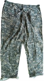 BYO Sniper Ghillie Pants.We sew out knotted nylon netting directly to Military Pants, then attach a 1000 Denier Cordura material to the front.The Cordura has a urethane coating so it's water-proof. The netting is double stitched to the pants for maximum durability.All front pockets have been removed so you won't feel the bumps when crawling.Back pockets are accessible.Made in the USA. The Desert color will have a Tan colored netting.Use your own materials to garnish the Pants, or order our synthetic thread. If ordering our thread, the pants only needs about 2 bundles, or 1 pounds of thread.